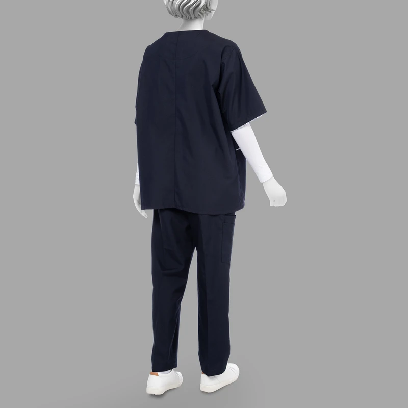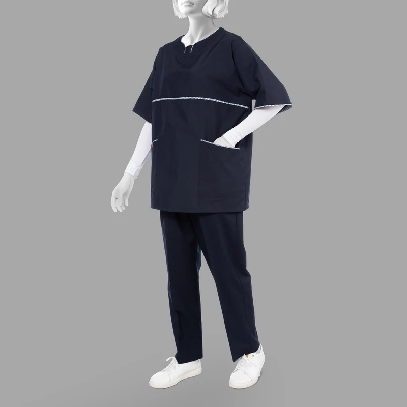 این ست لباس با آستینهای کیمونو، آزادی حرکت بیشتری را فراهم میکند و به شما این امکان را میدهد که بدون هیچگونه محدودیتی به انجام وظایف خود بپردازید. یقه کشبافت این روپوش نیز علاوه بر زیبایی، به راحتی در پوشیدن و درآوردن لباس کمک میکند و احساس راحتی بیشتری را در طول روز کاری شما ایجاد میکند.